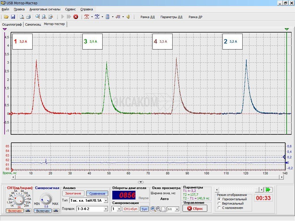 - Токовые клещи можно применять при диагностике первичной системы зажигания. Для этого нужно запустить ПО Disco4 – Мотор-тестер – Сравнение далее выбрать нужный диапазон работы токовых клещей.
