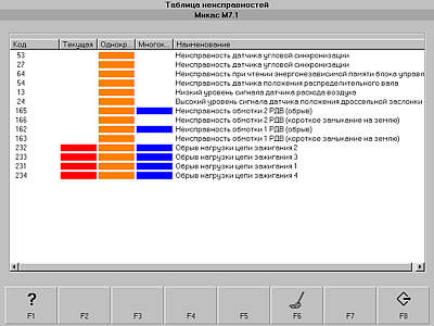Считывание, расшифровка и стирание кодов неисправностей - в этом режиме осуществляется считывание и обнуление кодов неисправностей (ошибок) регистрируемых ЭБУ диагностируемой системы. На экран выводятся цифровые коды ошибок, типы обнаруженных ошибок (текущие, сохраненные) и их расшифровка.