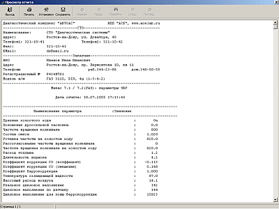 Сохранение результатов диагностики в базу данных программы — программа «АВТОАС-СКАН» позволяет позволяет сохранять коды обнаруженных неисправностей и мгновенное значение текущих параметров работы системы в базу данных программы, с привязкой к конкретному автомобилю и автовладельцу, в виде текстовых отчетов для последующего просмотра и распечатки. Так же предоставляется возможность сохранять графики параметров работы системы (до 40 сек) с последующим просмотром.