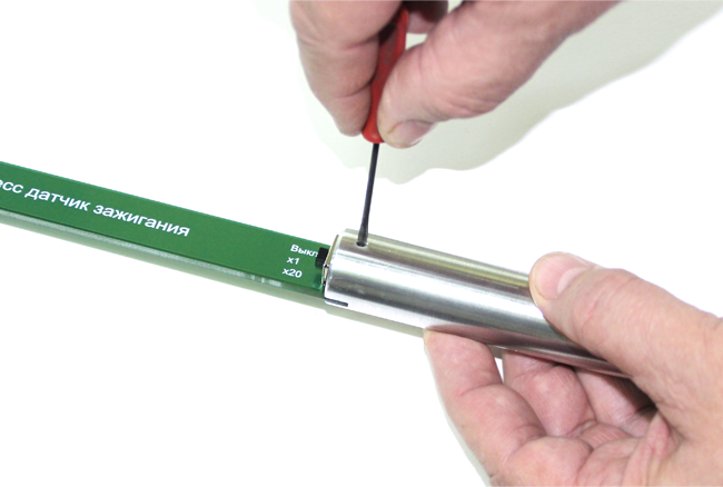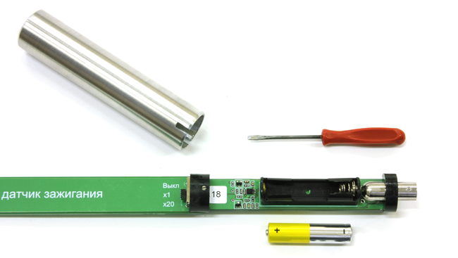 Под съемной ручкой датчика размещен держатель элемента питания. Инструкция по установке/замене элемента питания приведена в паспорте активного экспресс датчика зажигания в разделе "Подготовка к работе".