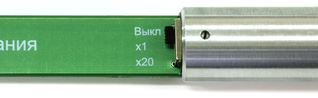 Включение питания и выбор чувствительности датчика производится с помощью переключателя режимов