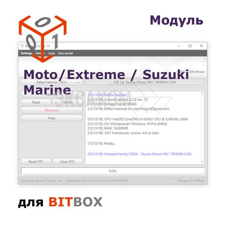![]() | BitBox программа для чип тюнинга, Ключ защиты это развивающийся программный комплекс, который позволяет производить идентификацию, чтение и запись внутренней флеш-памяти блоков управления различного назначения. Работа с блоками осуществляется через CAN или K-line интерфейсы данных при помощи адаптера Pass-thru J2534. Ключ без модулей не продается! | 00000005629 | 2 000 |