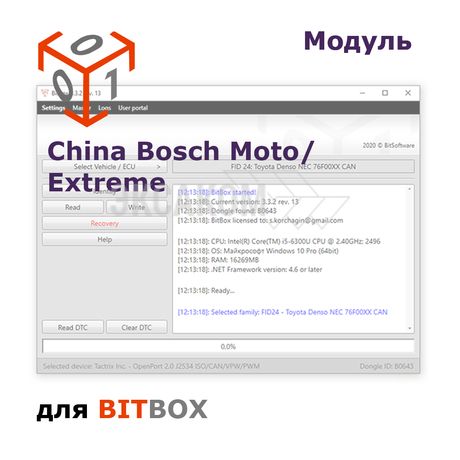 ![]() | BitBox программа для чип тюнинга, Ключ защиты это развивающийся программный комплекс, который позволяет производить идентификацию, чтение и запись внутренней флеш-памяти блоков управления различного назначения. Работа с блоками осуществляется через CAN или K-line интерфейсы данных при помощи адаптера Pass-thru J2534. Ключ без модулей не продается! | 00000005629 | 2 000 | |