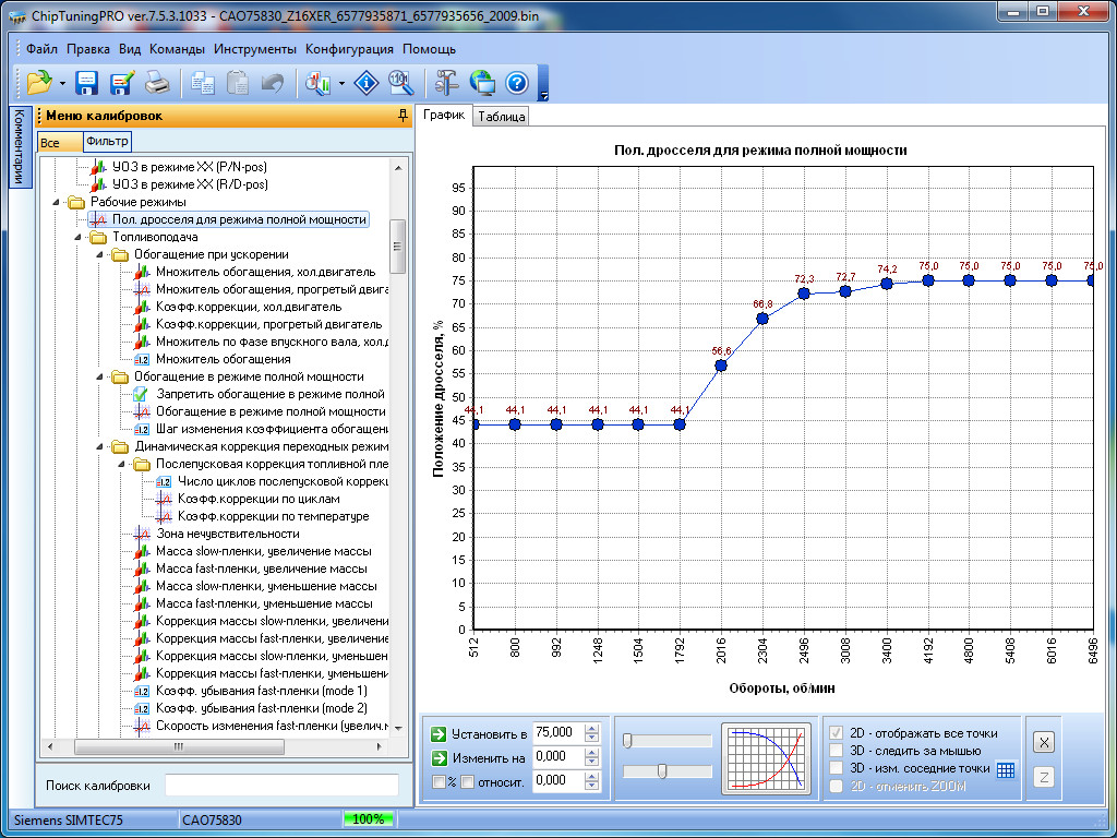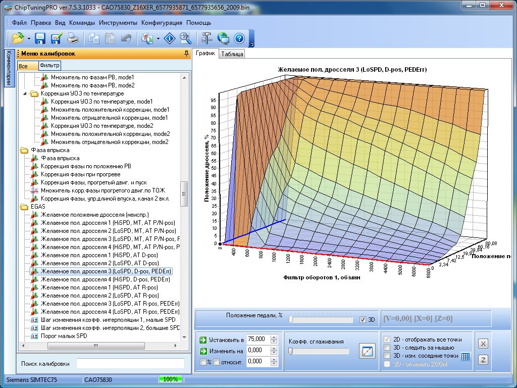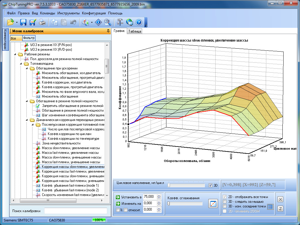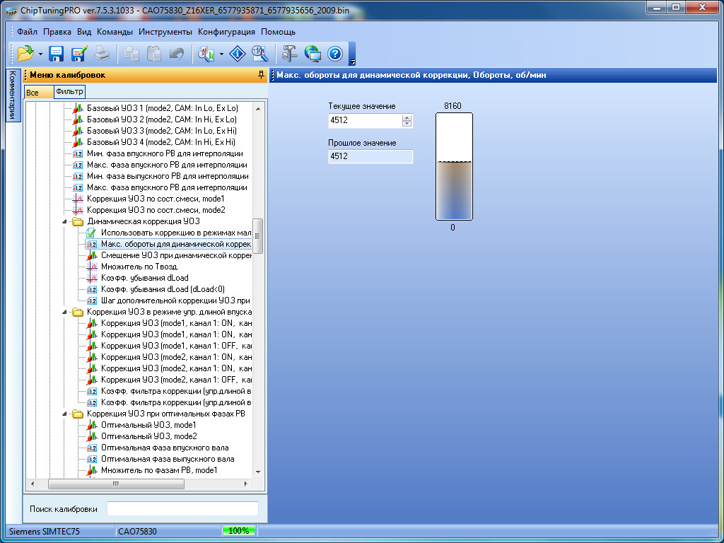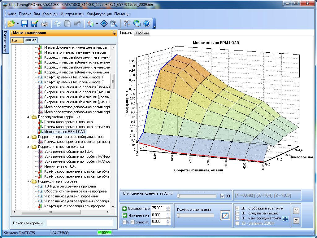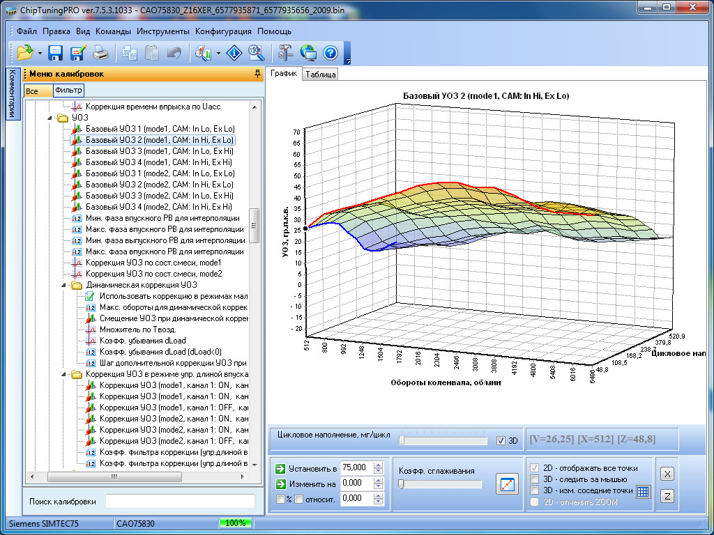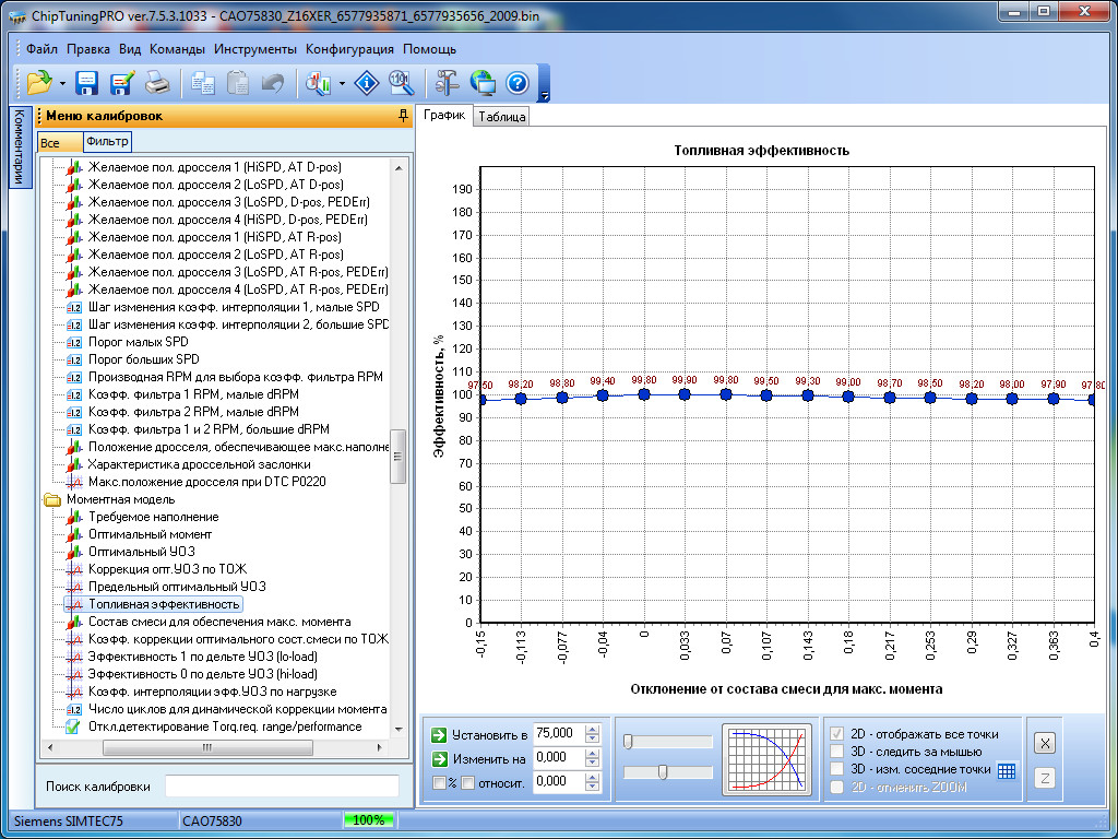Карты содержат более 270 калибровок ЭСУД SIMTEC75: пусковые калибровки (топливоподача, УОЗ, фаза впрыска, положение дросселя при пуске и др.), УОЗ и его коррекции, фазу впрыска, состав смеси, различные коррекции состава смеси, калибровки моментной модели, EGAS, калибровки системы регулирования фаз ГРМ и геометрии впускного тракта, калибровки лямбда-регулирования, обороты отключения топлива, тарировки датчиков, маску DTC и др.