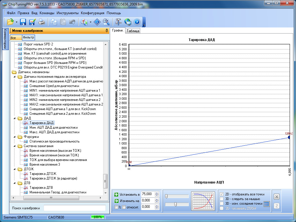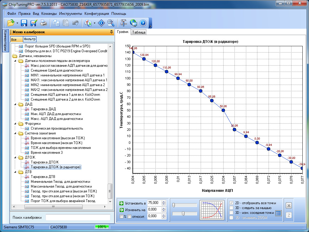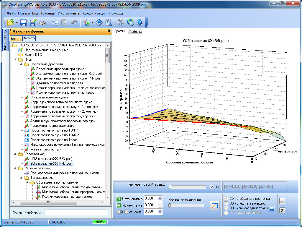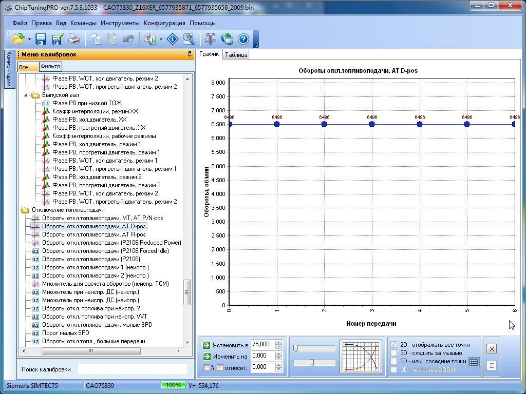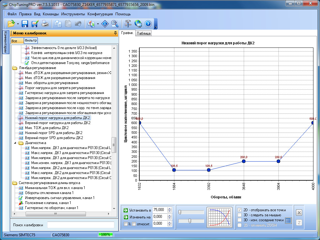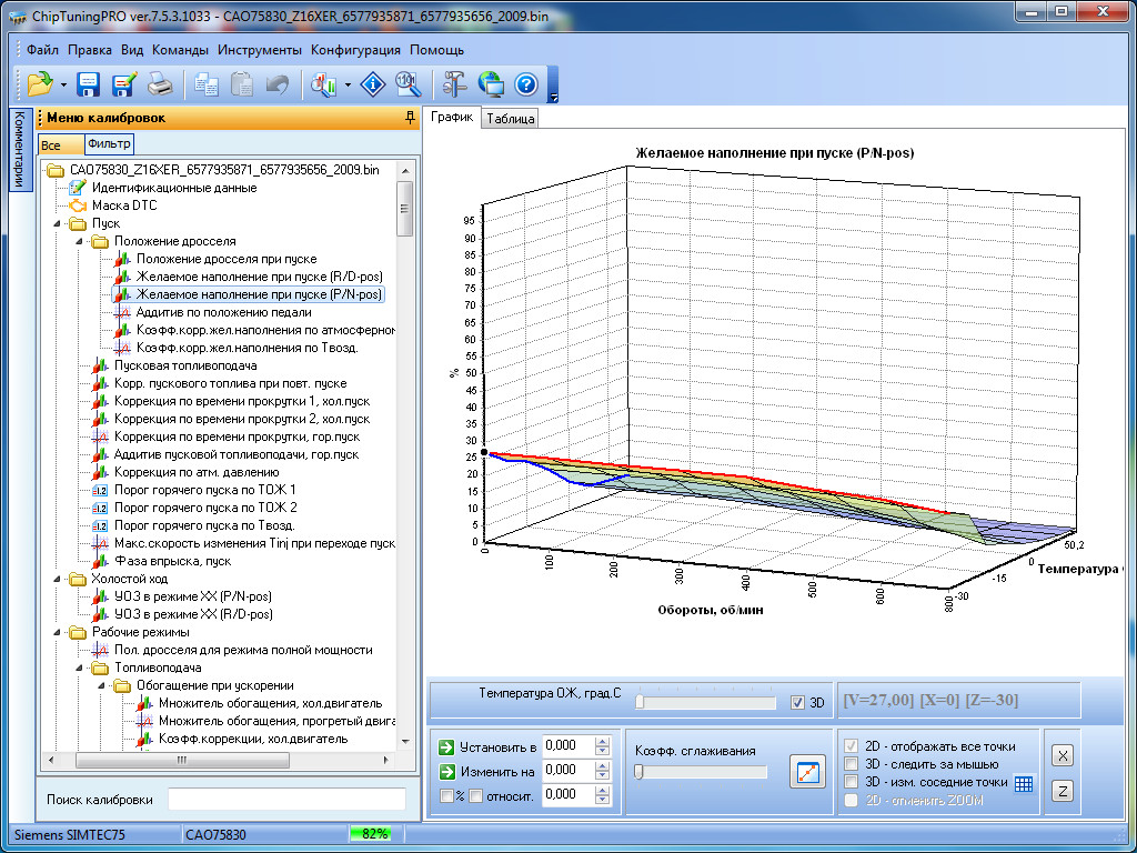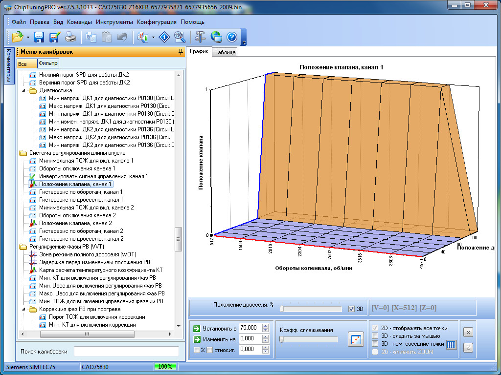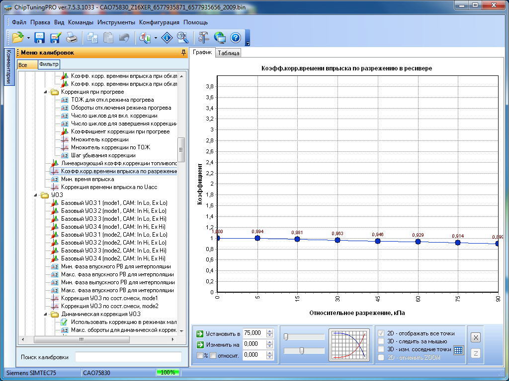 Карты содержат более 270 калибровок ЭСУД SIMTEC75: пусковые калибровки (топливоподача, УОЗ, фаза впрыска, положение дросселя при пуске и др.), УОЗ и его коррекции, фазу впрыска, состав смеси, различные коррекции состава смеси, калибровки моментной модели, EGAS, калибровки системы регулирования фаз ГРМ и геометрии впускного тракта, калибровки лямбда-регулирования, обороты отключения топлива, тарировки датчиков, маску DTC и др.