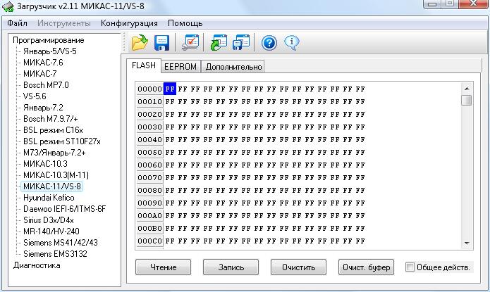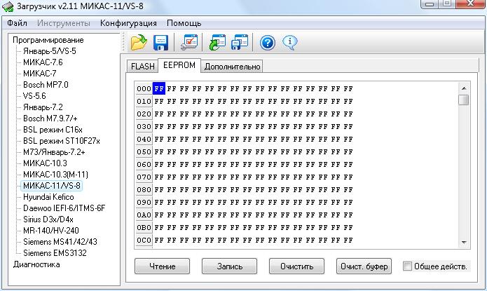 Наличие галочки в поле Общее действ. позволяет производить выбранные операции одновременно с FLASH и EEPROM памятью контроллера за один сеанс связи.