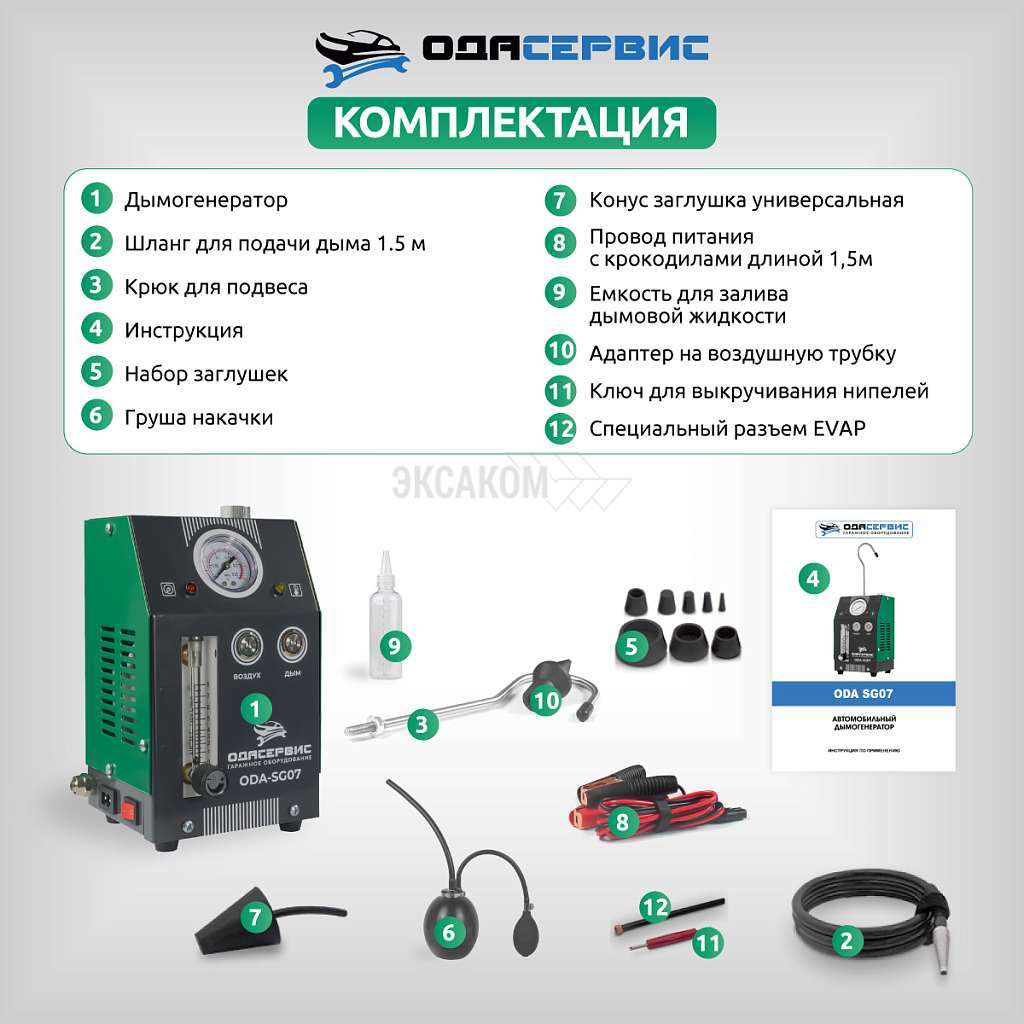Комплектация Дымогенератор автомобильный, 2 режима работы, встроенный насос, регулировка потока ОДА Сервис ODA-SG07
