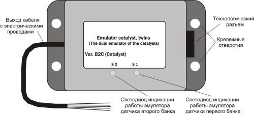 Двухканальный эмулятор дополнительных датчиков кислорода B2C, предназначен для эмуляции сигналов контролирующих (S2) датчиков кислорода (ДК) на двигателях с 2-мя независимыми системами выпуска, имеющие два передних (верхних, управляющих) ДК и два ДК после катализатора (контролирующих), то есть, имеет два независимых канала, заменяя собой два однокональных устройства.