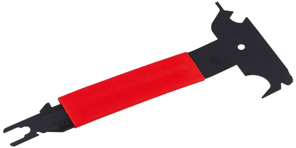 Инструмент из закаленной пружинной стали, красная пластиковая ручка.