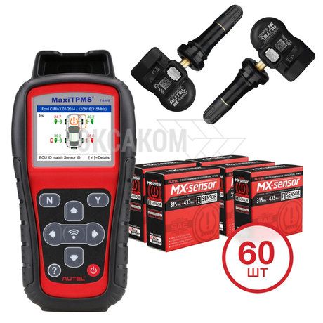 Комплект из 60 универсальных датчиков контроля давления в шинах и программатора MaxiTPMS TS508WF. Разработан для обслуживания систем контроля давления в шинах на легковых автомобилях. Программирование датчиков осуществляется по радиоканалу, диагностическая связь обеспечивается по кабелю, обновление через Wi-Fi