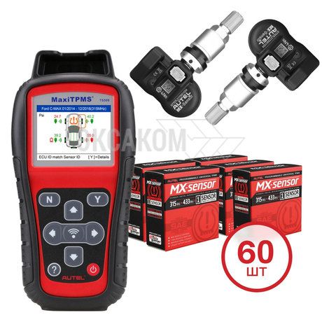 Комплект из 60 универсальных датчиков контроля давления в шинах и программатора MaxiTPMS TS508WF. Разработан для обслуживания систем контроля давления в шинах на легковых автомобилях. Программирование датчиков осуществляется по радиоканалу, диагностическая связь обеспечивается по кабелю, обновление через Wi-Fi