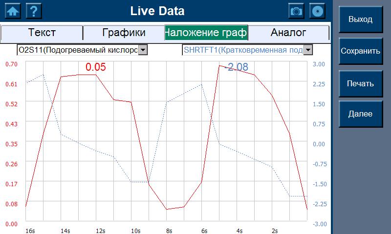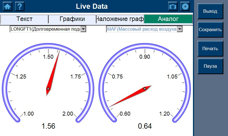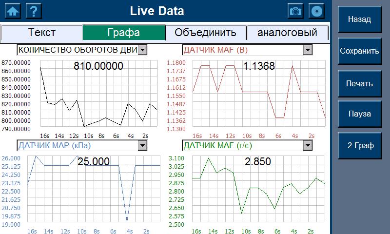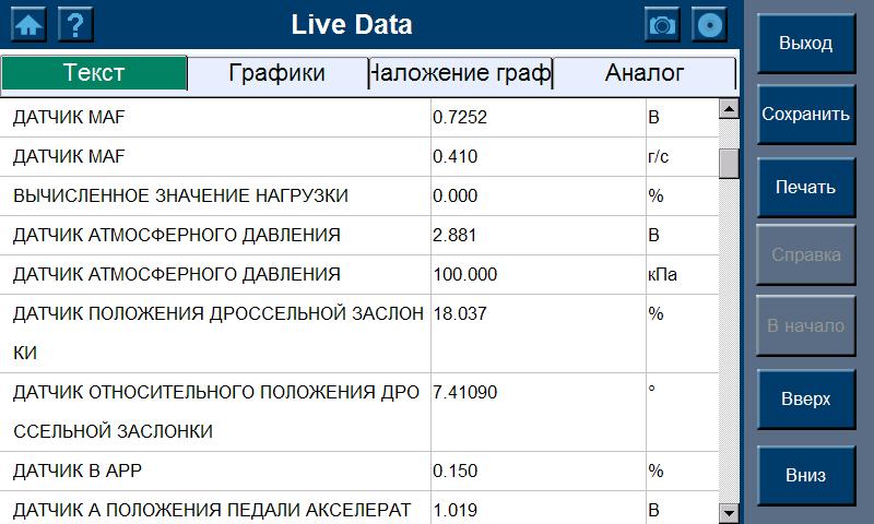 - Вывод на дисплей потоковых данных в виде аналоговых указателей, текстовом режиме, а так же диаграммой