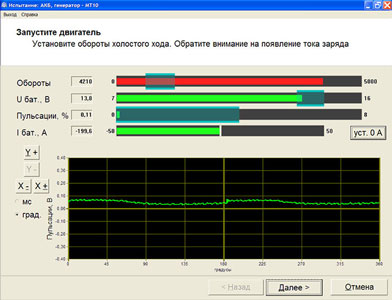 - проверка работы генератора и системы зарядки аккумулятора (вых. напряжение и ток генератора с определением неисправностей выпрямительных диодов, реле-регулятора, зависания щеток и т.д.).