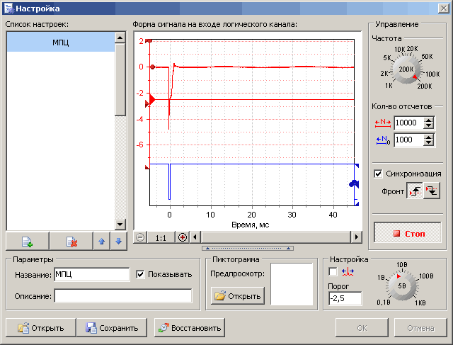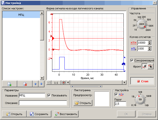 При отсутствии ложных меток рекомендуется выбрать входной диапазон ±5 В, а порог задать -2,5 В, при наличии значительных ложных меток (наводки от искрообразования в соседних цилиндрах или холостая искра) рекомендуется выбрать входной диапазон ±10 В, а порог задать -5 В. В случае положительной полярности импульсов первого цилиндра (DIS системы зажигания) задавать те же значения порога но со знаком плюс.