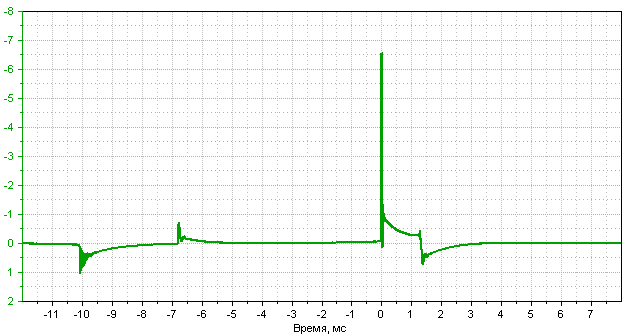 Осциллограмма импульса вторичного напряжения снятая с помощью емкостного датчика первого цилиндра. По сравнению с ВВ датчиком амплитуда сигнала больше в 50 раз, что важно для стабильной синхронизации, но в тоже время форма импульса искаженна, что не важно для синхронизации.