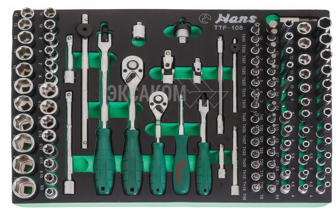 TTF-108 Набор трещоток, бит, торцевых головок и аксессуаров Hans на 1/4", 3/8", 108 предметов