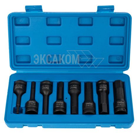 Набор включает в себя 8 ударных головок — бит HEX H5-H19, изготовленных из хром ванадиевой стали.