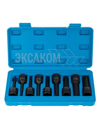 Набор включает в себя 9 ударных головок — бит SPLINE M4-M16, изготовленных из хром ванадиевой стали.
