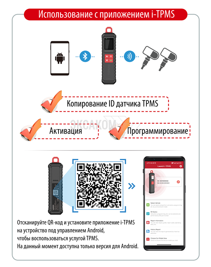 - Используется совместно со сканероми Launch или с отдельным приложением i-TPMS (Андройд устройства).