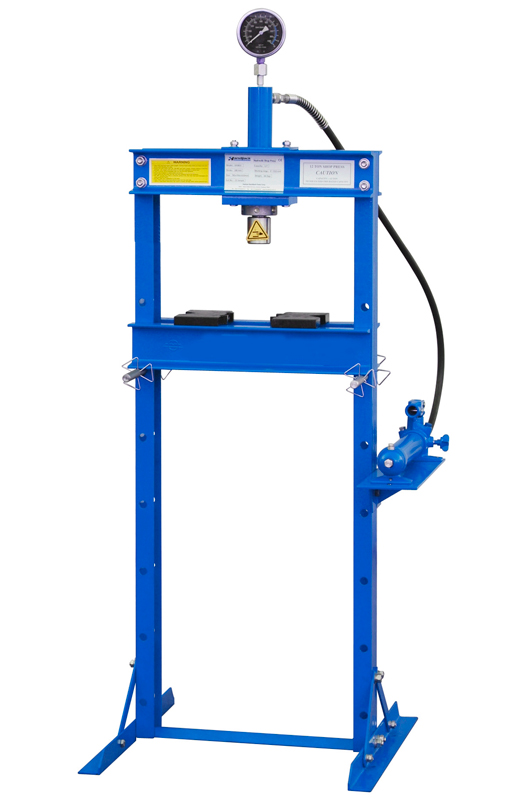 Напольный гидравлический пресс на 12 т с ручным насосом и манометром для отображения развиваемого усилия, ход штока 180 мм, рабочее пространство 0...918 мм, Ширина станины 510 мм