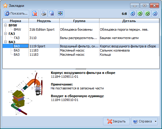 | Обычно Вы просматриваете одни и те же иллюстрации или есть такие, на которые Вы регулярно возвращаетесь. Чтобы каждый раз не проходить весь путь, начиная с выбора каталога, марки и модели и т.п. существует возможность поставить закладки. Вы можете сделать неограниченное количество закладок к любым иллюстрациям. Таким образом, Ваша работа увеличивается в скорости в несколько раз. | |