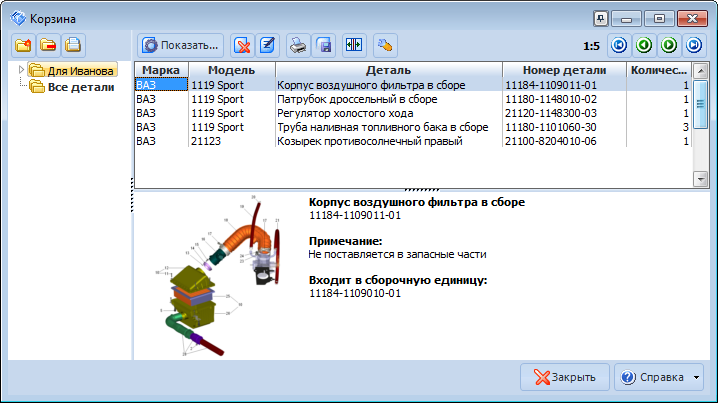 | Если Вам нужно сделать список содержащий N-ое количество деталей, то для того чтобы вручную не переписывать из программы оригинальное название и номер Вы можете использовать Корзину. Кроме названия детали и ее номера, в корзине так же можно указать необходимое количество. Таким образом, Вы быстро составите необходимый список деталей. | |