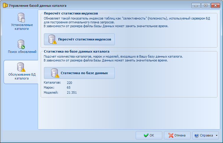 | При работе с большими базами всегда возникал интерес, а сколько же всего записей, в нашем случае иллюстраций и деталей, загружено в базу. Если в справочнике 3 записи, то это легко посчитать, а если несколько сотен? Вручную не посчитать! Появилась возможность узнать сколько иллюстраций и деталей загружено в справочник нажатием всего одной кнопки. В модуле "АвтоДилер: Каталог" существует возможность получения статистики по количеству загруженных каталогов, марок, иллюстраций и деталей. |