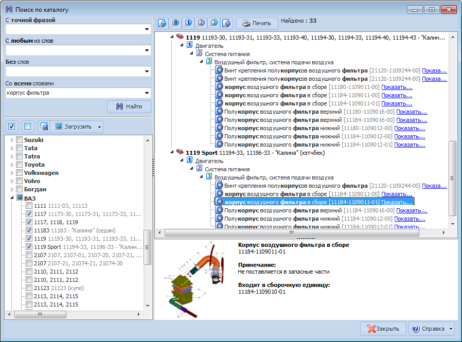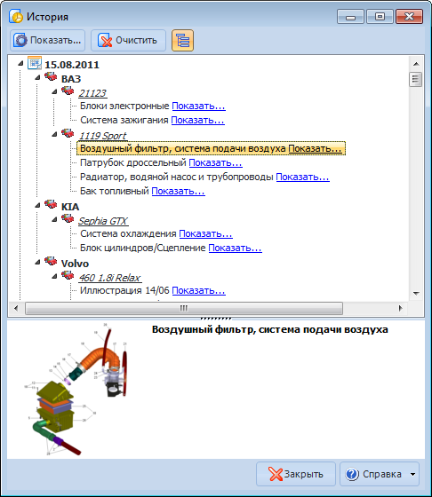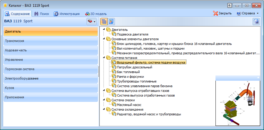 | Детали каждой модели логично сгруппированы по основным узлам автомобиля и могут быть представлены в двух вариантах: в виде дерева-списка или в виде галереи изображений. | |