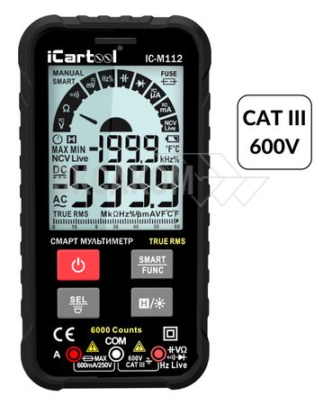 iCartool IC-M112 - интеллектуальный цифровой мультиметр с категорией электробезопасности CAT III 600V для решения задач по проверке, тестированию и диагностике электрооборудования. Мультиметр может использоваться как для бытового, так и для профессионального использования. Его основной особенностью является автоматический (интеллектуальный) режим, в котором он сам распознает измеряемый параметр: постоянное/переменное напряжение, сопротивление или контроль целостности цепи. Для выбора других режимов используется всего одна кнопка. Полученные значения выводятся на большой ЖК дисплей 6000 отсчетов с подсветкой.