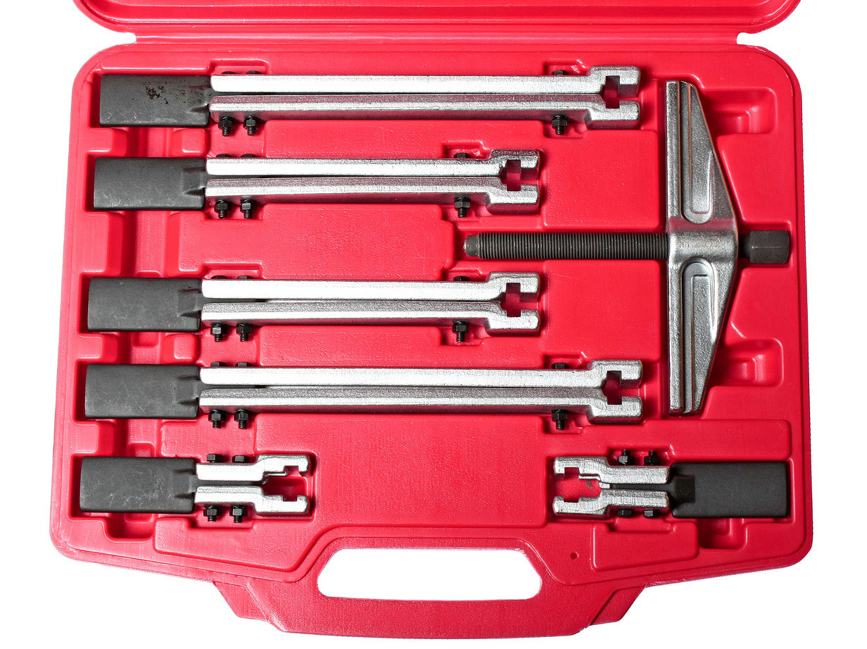 Съёмник подшипников, 2-х захватный, кейс, 8 предметов, МАСТАК 104-12008C предназначен для демонтажа деталей, запрессованных в обойму или установленных на вал. Конструкция съемника позволяет регулировать как ширину захвата, так и глубину. Съемник изготовлен из инструментальной закаленной стали, что позволяет использовать его в тяжелых условиях под действием больших нагрузок.