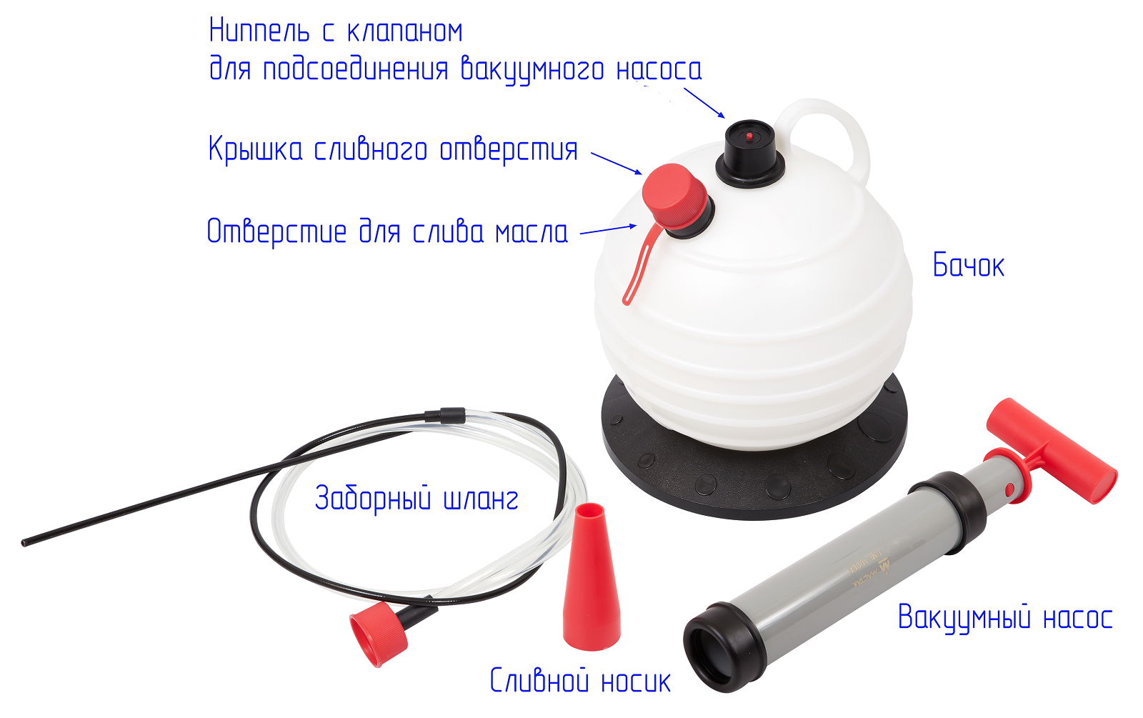 Устройство для слива масла, 6 л, МАСТАК 130-10006 - это простое в использовании оборудование, позволяющее осуществить замену необходимой технической жидкости даже в бытовых условиях. Составляющие данной модели, а именно: насос, бачок, носик и крышка слива, - изготовлены из высокопрочного пластика, устойчивого к различным химическим воздействиям. Большой комплект поставки дает возможность применения устройства во время ремонта и обслуживания большинства известных марок автомобилей.