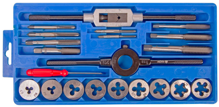 - метчики и плашки – M3×0.5, M4×0.7, M5×0.8, M6×1.0, M7×1.0, M8×1.25, M10×1.5, M12×1.75, 1/8NPT27; метчикодержатель – 1 шт.;