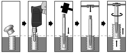 Используется, когда крепёж обломан заподлицо с деталью, и нет возможности применить эксцентриковый шпильковёрт.