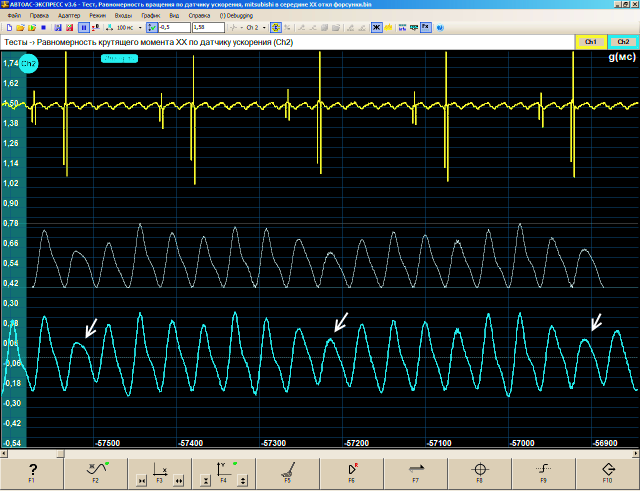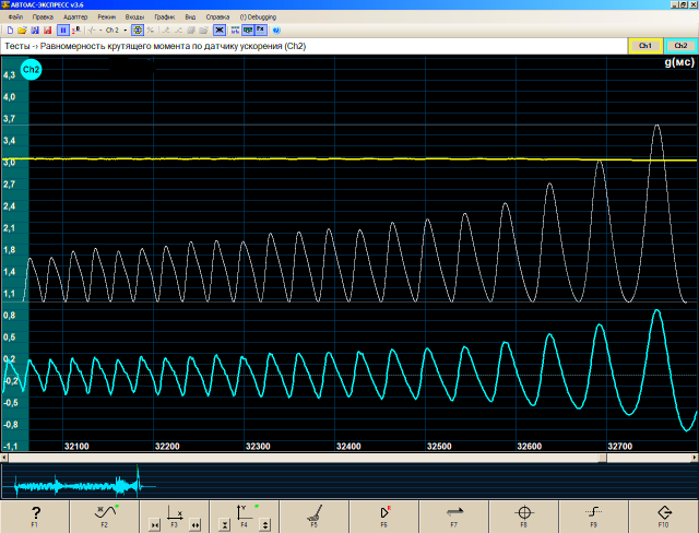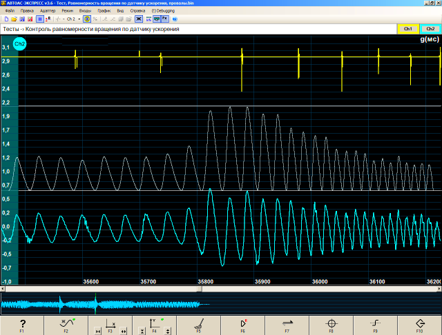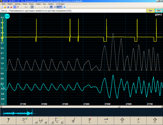 Белый график - нормированный сигнал ускорения: сигнал акселерометра фильтруется (сглаживается, для подавления помех); участки начала отклонения двигателя в сторону, противоположную вращению коленчатого вала, привязываются к общему уровню. Желтый график - сигнал от щупа-делителя, расположенного рядом с ИКЗ одного из цилиндров: сигнал наводки от ИКЗ использован для синхронизации.