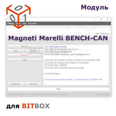 ![]() | BitBox программа для чип тюнинга, Ключ защиты это развивающийся программный комплекс, который позволяет производить идентификацию, чтение и запись внутренней флеш-памяти блоков управления различного назначения. Работа с блоками осуществляется через CAN или K-line интерфейсы данных при помощи адаптера Pass-thru J2534. Ключ без модулей не продается! | 00000005629 | 2 000 |