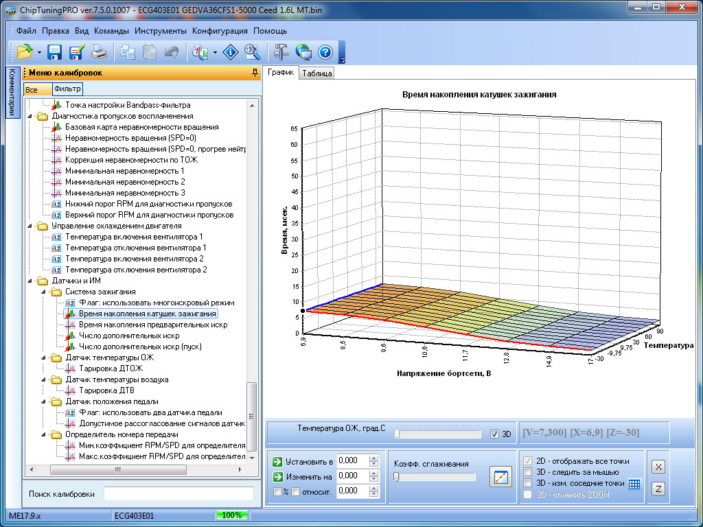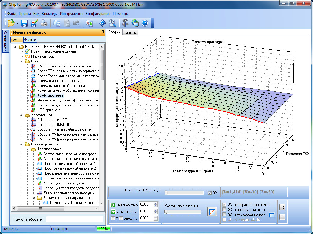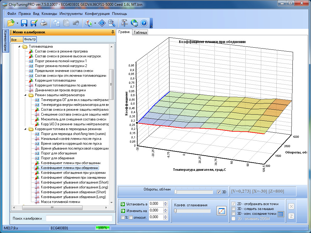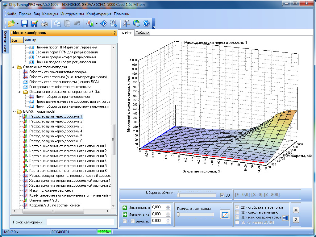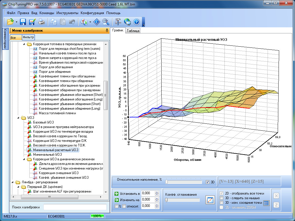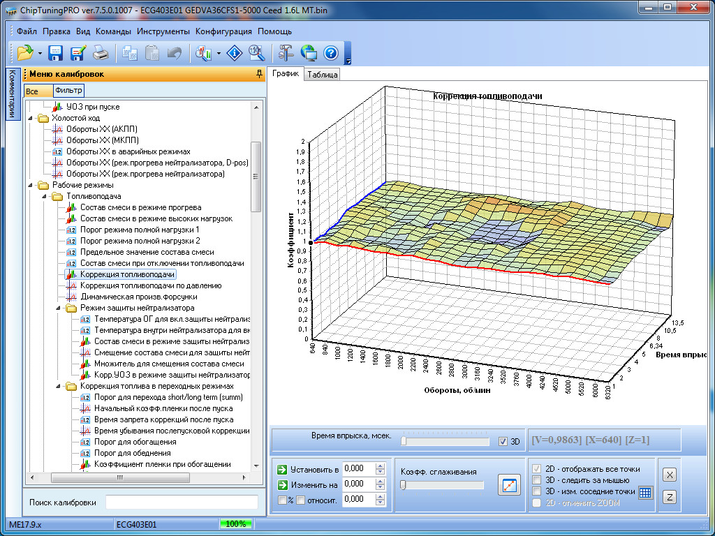 Для изменения доступны все наиболее важные калибровки: пусковые параметры, УОЗ и его коррекции во всех режимах, топливоподачу с динамическими коррекциями, фазу впрыска, калибровки моментной модели, калибровки системы VVT, маску ошибок, тарировки датчиков и многое другое.