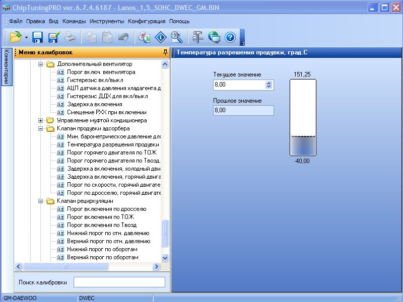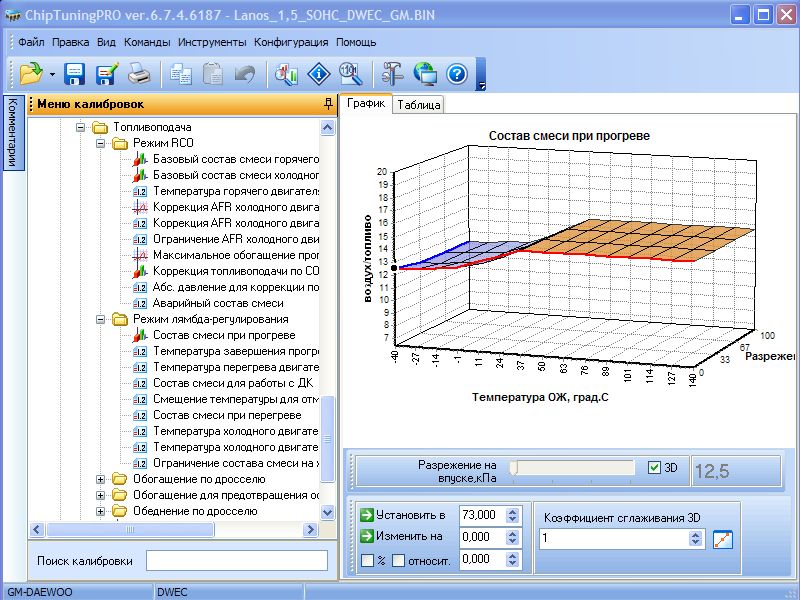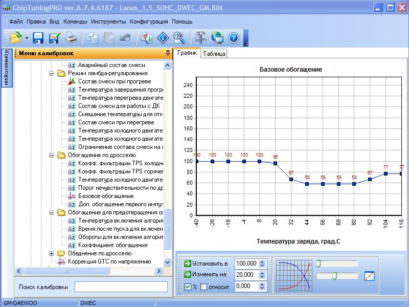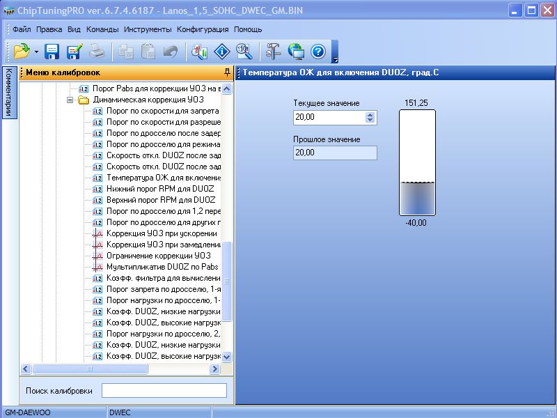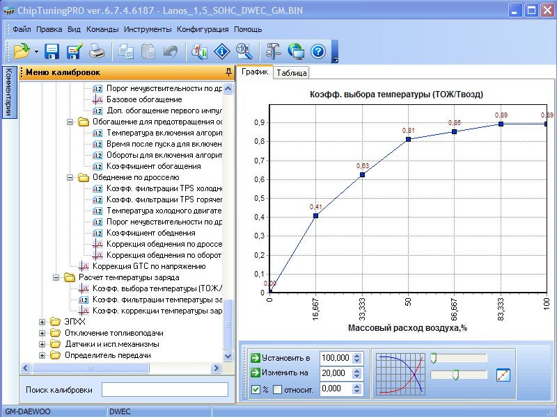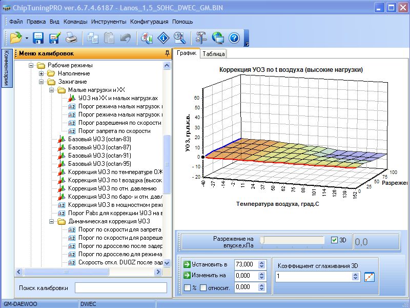 В остальных картах поддерживаются следующие калибровки: УОЗ в рабочих режимах (4 таблицы), коррекция УОЗ по температуре ОЖ и температуре воздуха, составы смеси в рабочих режимах, обороты отсечки топливоподачи, температура включения вентилятора, тарировки ДТВ и ДТОЖ.