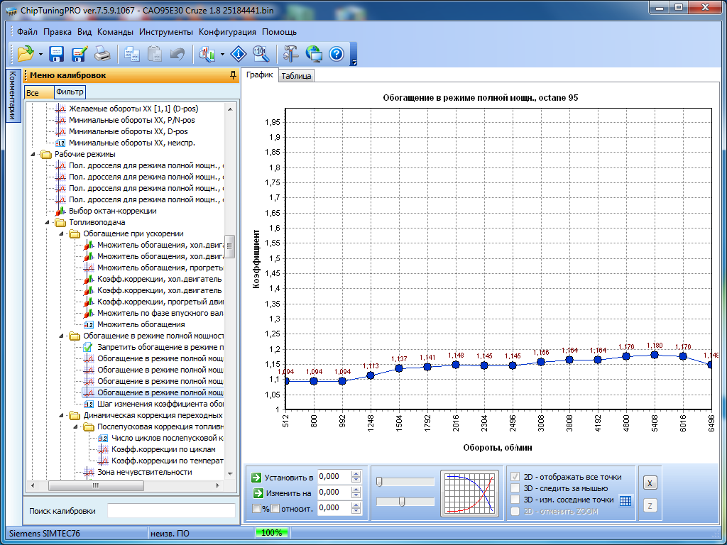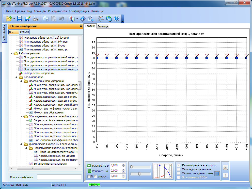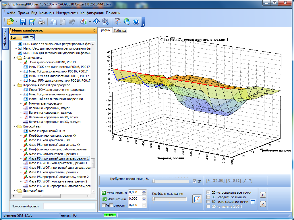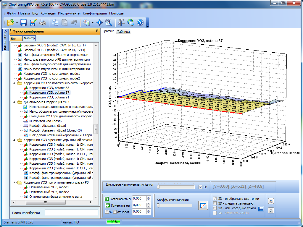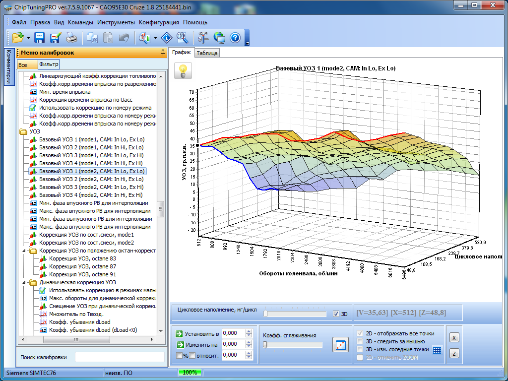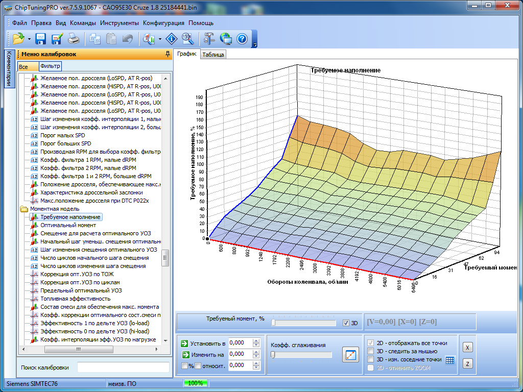 Карты содержат более 400 калибровок ЭСУД SIMTEC76: пусковые калибровки (топливоподача, УОЗ, фаза впрыска, положение дросселя при пуске и др.), УОЗ и его коррекции, фазу впрыска, состав смеси, различные коррекции состава смеси, калибровки моментной модели, EGAS, калибровки системы регулирования фаз ГРМ и геометрии впускного тракта, калибровки лямбда-регулирования, обороты отключения топлива, тарировки датчиков, маску DTC и др.