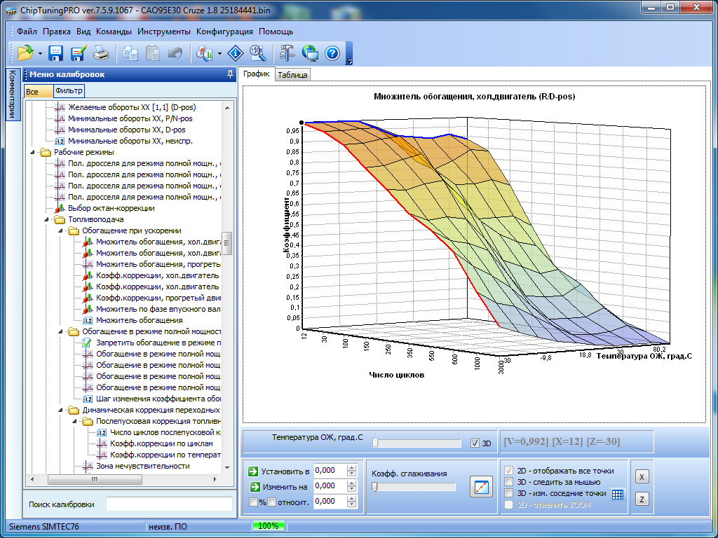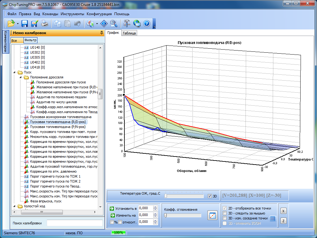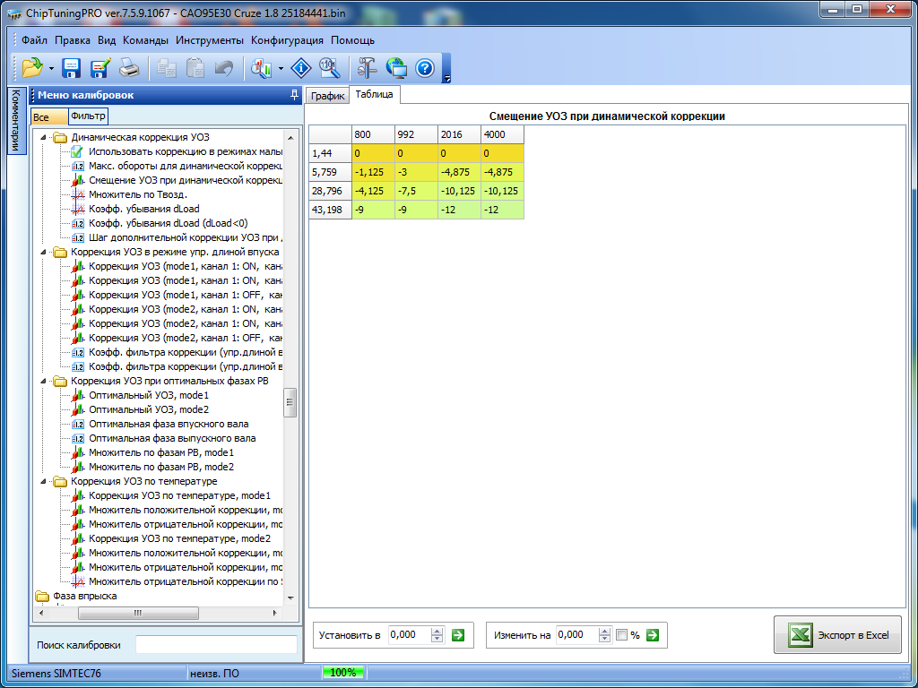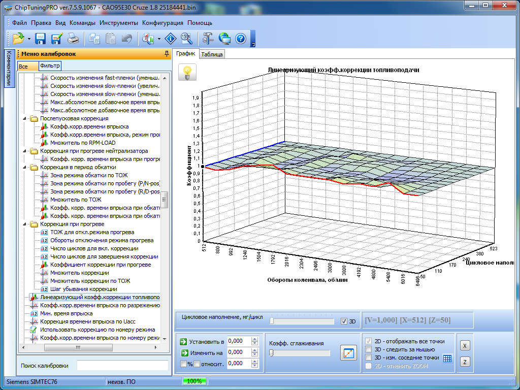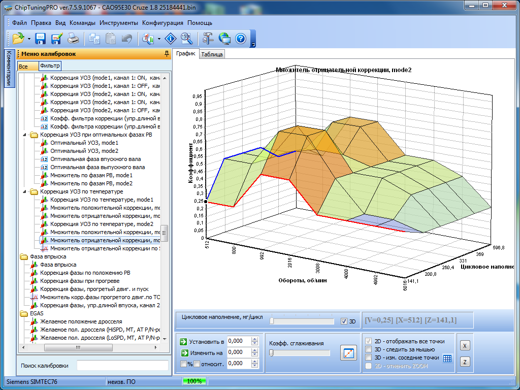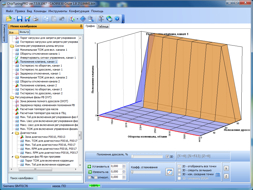 Карты содержат более 400 калибровок ЭСУД SIMTEC76: пусковые калибровки (топливоподача, УОЗ, фаза впрыска, положение дросселя при пуске и др.), УОЗ и его коррекции, фазу впрыска, состав смеси, различные коррекции состава смеси, калибровки моментной модели, EGAS, калибровки системы регулирования фаз ГРМ и геометрии впускного тракта, калибровки лямбда-регулирования, обороты отключения топлива, тарировки датчиков, маску DTC и др.