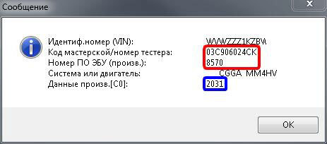 Текущая кодировка ЭБУ отображена в виде идентификаторов, указанных в синей рамке.