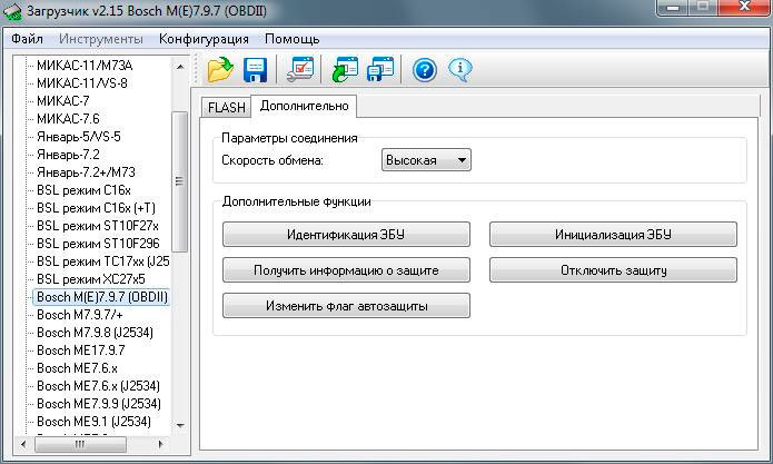 · Отключить защиту – (только для ЭБУ Bosch M7.8) отключает защиту процессора. В зависимости от типа ЭБУ возможно необходимо подключить контакты CAN от J2534-совместимого устройства.