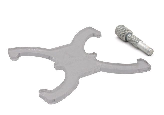 Внимание! Фиксатор фазорегуляторов FORD 303-1097 (материал акрил) используется только для фиксации зубчатых колес, который используется для позиционирования распредвалов по меткам. Не использовать данный фиксатор для затягивания или откручивания болтов крепления фазорегуляторов. Использование инструмента не по назначению лишает гарантии на набор. Для профессионального использования рекомендуем приобрести набор CT-A2217.