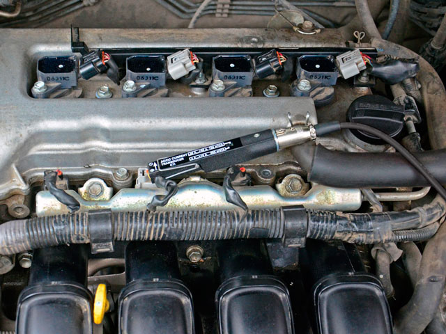 Установка токовых клещей CTi на один из электрических проводов, по которым осуществляется управление топливной форсункой Common Rail.