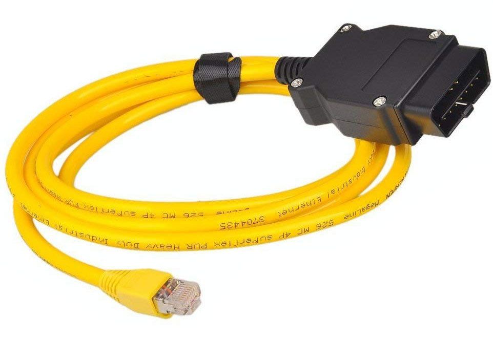 Диагностический шнур для диагностики автомобилей BMW F-Series. Устройство подключается к сетевой карте компьютера или ноутбука и не требует более никаких специальных адаптеров. Для работы со сканером на ПК должно быть установлено специализированное ПО BMW ISTA/D Rheingold, E-SYS. Программное обеспечение в поставку не входит.
