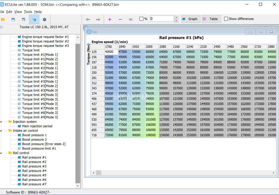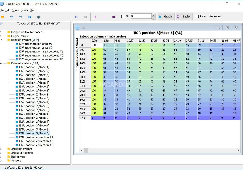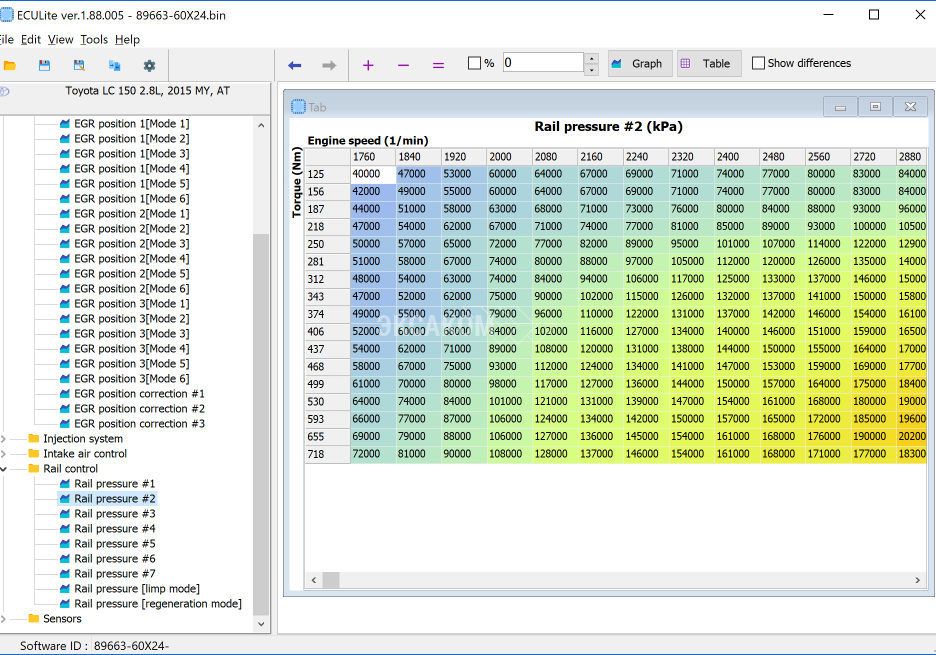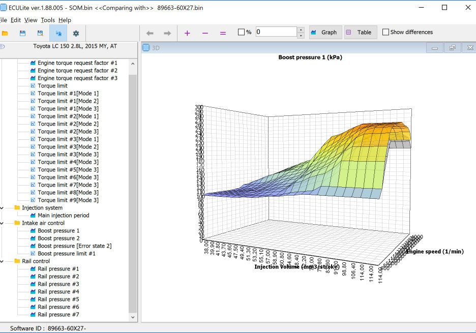 Для дизельных систем доступны карты давления наддува, запроса крутящего момента, фазы начала впрыска, времени впрыска, давления топлива, таблица клапана рециркуляции (EGR), маска детектирования ошибок и др.