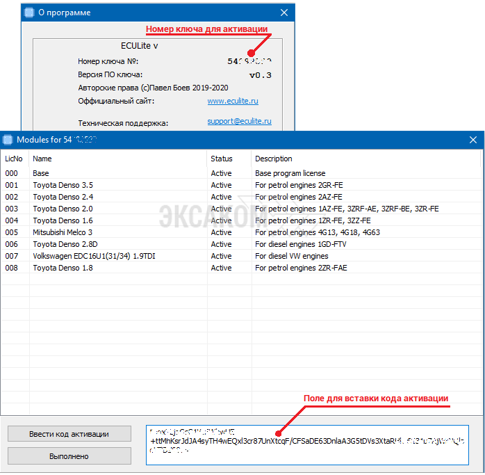 - Активация приобретенных модулей производится с помощью ввода кодов, генерируемых по номеру ключа.