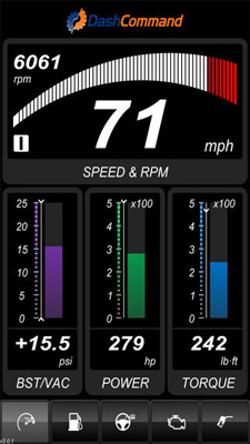 DashCommand - популярная мультиплатформенная программа для самостоятельной диагностики OBDII-совместимых автомобилей при помощи адаптеров на базе чипов ELM 327. Среди множества отображаемых параметров можно выделить следующие: - Обороты двигателя, в том числе расчетные данные (средние показания, максимальные и т.д.) - Скорость автомобиля. - Положение дроссельной заслонки. - Положение педалей газа и тормоза (в процентах). - Расход топлива (средний, максимальный, в текущий момент, экономия). - Расчет расстояния и времени движения на оставшемся топливе. - Работа газораспределительного механизма. - Подача охлаждающей жидкости. - Работа катализатора. - Нагрузка на двигатель. - Показатель давления в баке. - Сводные показатели за несколько предыдущих поездок. - Общий пробег автомобиля. - Расчет затрат на топливо. - Полное логирование поездок (начало, продолжительность, затраченное время, топливо, средняя скорость и другие). - Фиксирование в памяти полных заправок. - Расчет ускорения. - Расчет крутящих моментов на узлах авто. - Количество остановок. - Логирование дистанций, пройденных на каждой из передач, в том числе на нейтральной. - Чтение ошибок и многое другое.