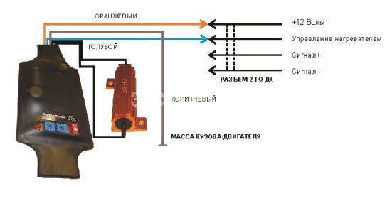 ВНИМАНИЕ!!! Так как обычно оба провода нагревателя имеют одинаковый цвет, провод +12 В можно легко перепутать с управляющим нагревателем проводом. Для того, чтобы избежать порчи прибора, при подключении его в цепь нагревателя пользуйтесь следующим правилом: при подключении прибора, если вы не уверены в правильности выбора напряжения питания +12 Вольт, подключите к гнезду разъема датчика кислорода сначала один провод, оранжевый +12, а коричневый на массу питания. Включив зажигание нужно следить за индикатором прибора. Если он горит постоянно, значит подключение правильное. Если не горит вообще или прерывисто мигает, следует поменять провод +12 на другой контакт. И только после этого, можно подключить голубой провод ко второму контакту нагревателя.