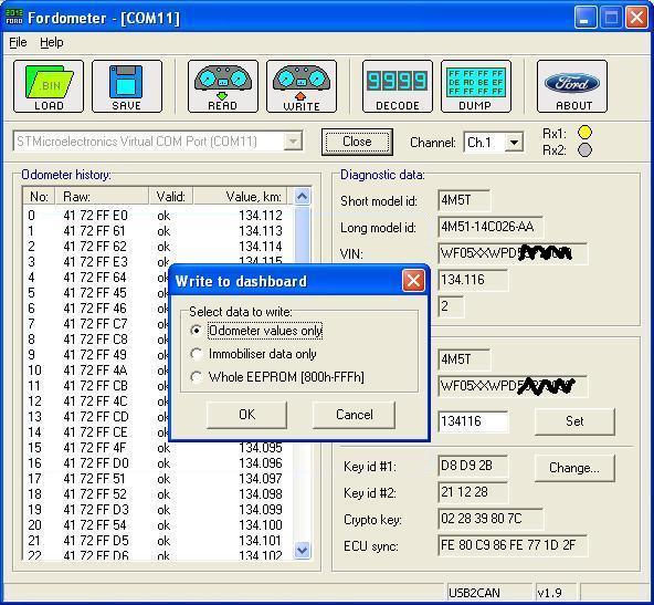 После выполнения соответствующих действий данные сохраняются в виртуальный ЕЕПРОМ , и только после нажатия на кнопку WRITE записываются в память процессора панели приборов.