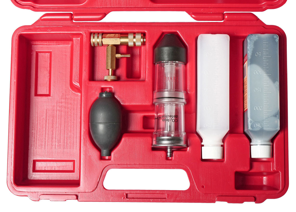 Тестер утечек выхлопных газов из камеры сгорания в системы охлаждения двигателей как с бензиновым, так и с дизельным впрыском. Результаты тестирования определяются изменением цвета специализированной жидкости.